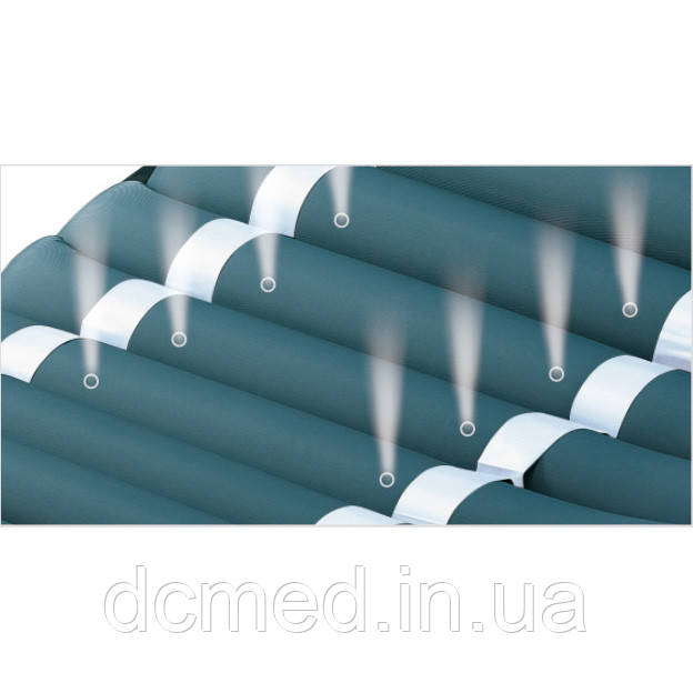- Основа матраца виготовлена з неалергенного і нетоксичного полівінілхлориду та нейлону. Завдяки лазерній мікроперфорації повітря в матраці активно циркулює, сприяючи підсушуванню шкіри і швидкому загоєнню ран. Легко миється й очищується.